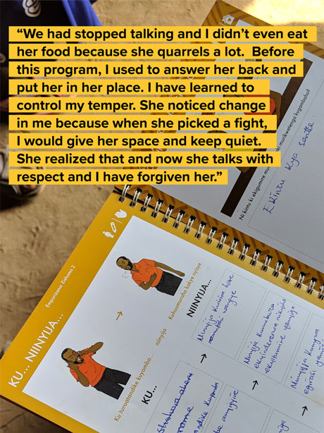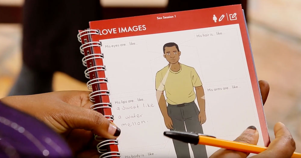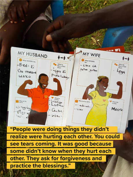 The couples guide is an exemplary tool that helps couples remember what they learned and captures the couple’s growth through activities such as writing vows together and organizing actions that make each other feel loved. It is almost entirely illustrated, designed to be used by illiterate users as an informative and interactive workbook.