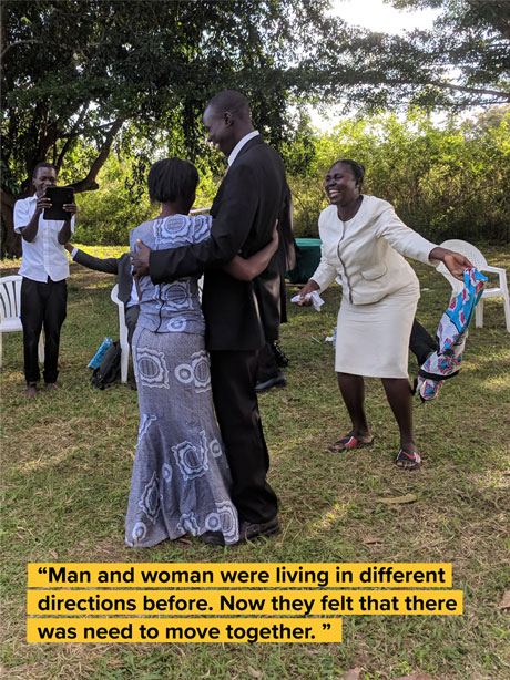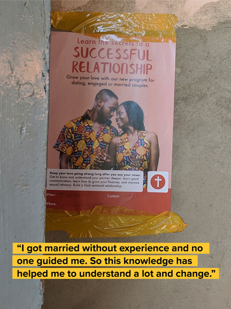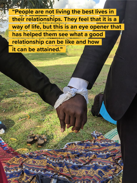 Our program relies on existing structures that the community appreciates and respects. In Uganda and many other east African countries, Christian couples are expected and highly motivated to attend pre-marital counseling programs at their local churches. These faith programs were identified during our research as a perfect contact point for preventing intimate partner violence for 3 main reasons: